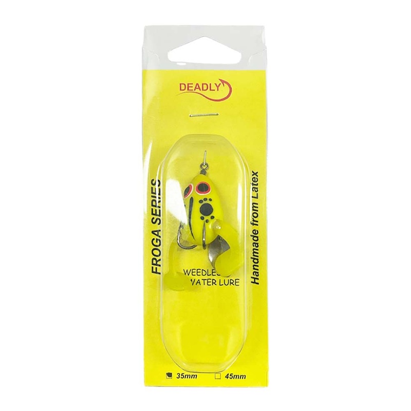 Presenting the Deadly Froga Cloga Lure, a topwater latex lure perfect for freshwater predators like bass and estuary perch. With dual paddle tails that create strong vibrations, this weedless lure is sure to attract fish from far and deep. The 35mm version also features a blade for added enticement for even the most timid fish.